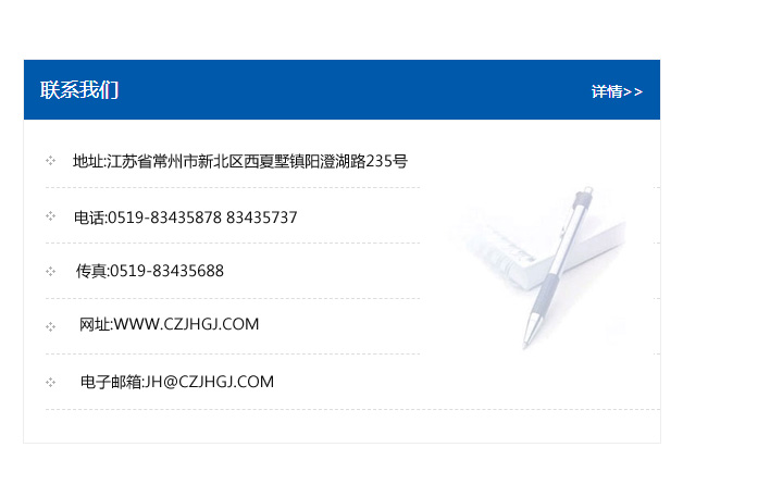 傳真:0519-83435688    郵編:213135    網址:WWW.czjhgj_com.zsliwei.com    電子郵箱:JH@czjhgj_com.zsliwei.com